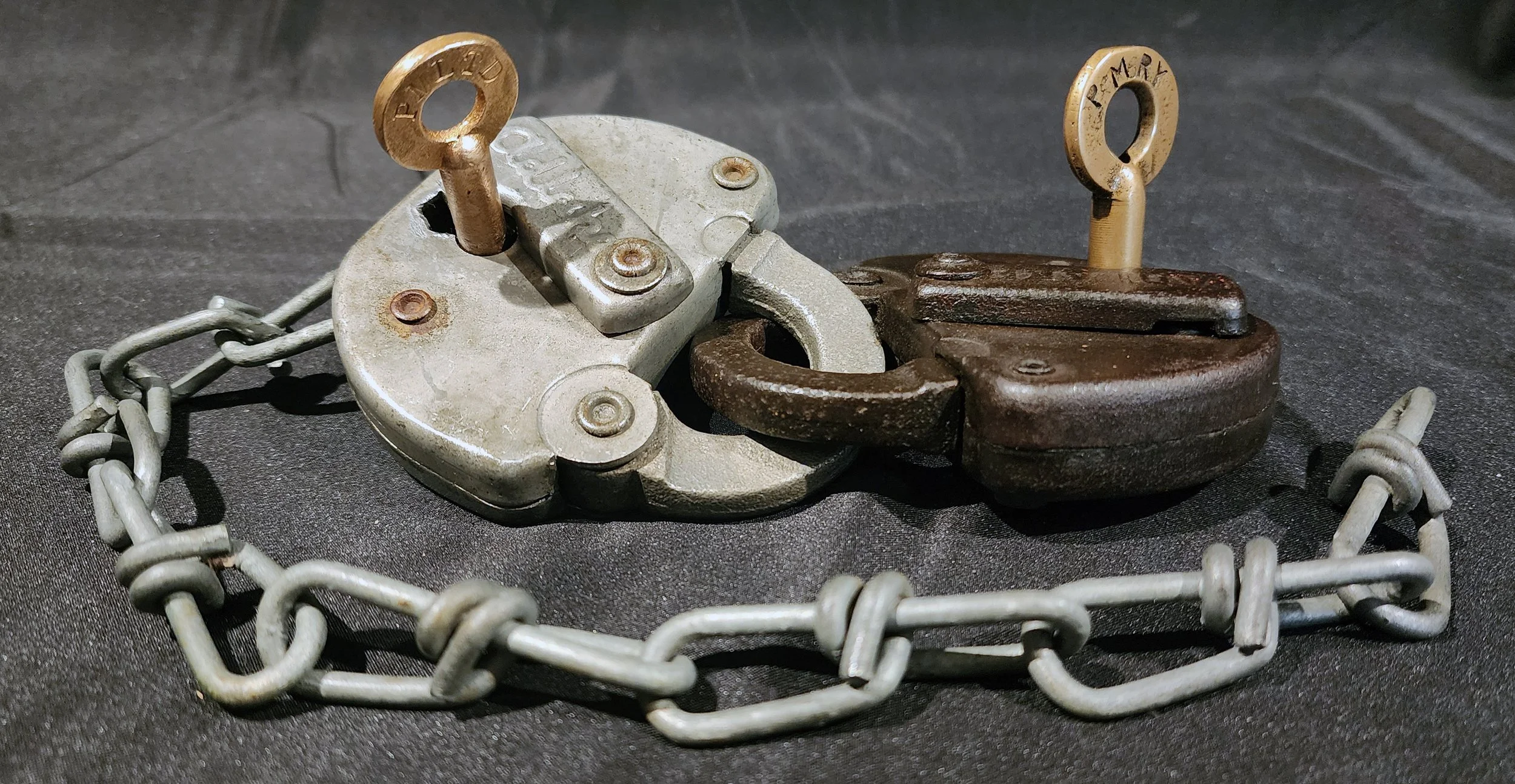 Pictured above: Adam Westlake (AW, Adlake, Adams) Reliables (1912 double guard Reliable, many 1913 Reliables), 1913 Switchman’s with wood bale, Pre-1895/1897 (2)/1908/1909 (2) Adams, Adlake 100, 200, 250(s), Kero(s), a Dietz #39 Standard (Bell bottom) and two Adams 1897, all with embossed/etched and/or stamped with PM(s), PMRY(s), PMRR(s) and/or Pere Marquette. All railroad, dead-flame lanterns have original burners & founts with either wire, leather wrapped, or wooden bails.