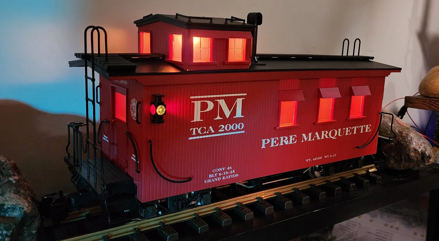Train Collectors Association (TCA 2000) Made by Charles Ro Manufacturing (USA Trains) for the 2000 TCA Convention #46, held in Grand Rapids, MI. A beautiful custom G Scale Woodside Caboose with working Markers (Lanterns)!